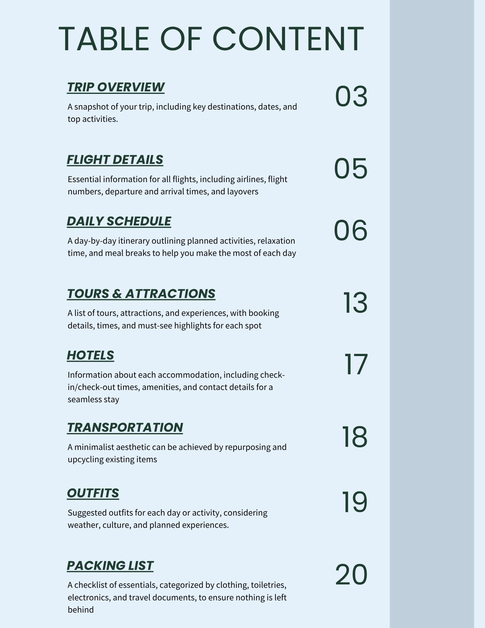 ✅ Daily Schedule — plan each day’s activities, meals, and must-sees